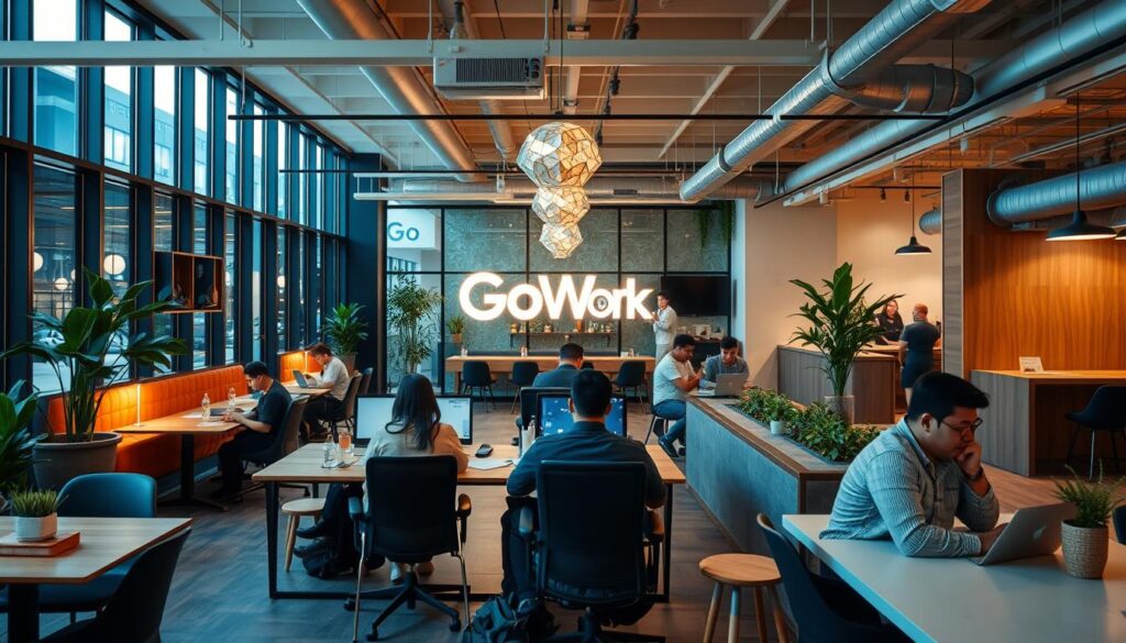 Gambar coworking space GoWork di Jakarta dengan fasilitas modern dan lingkungan kerja yang dinamis.