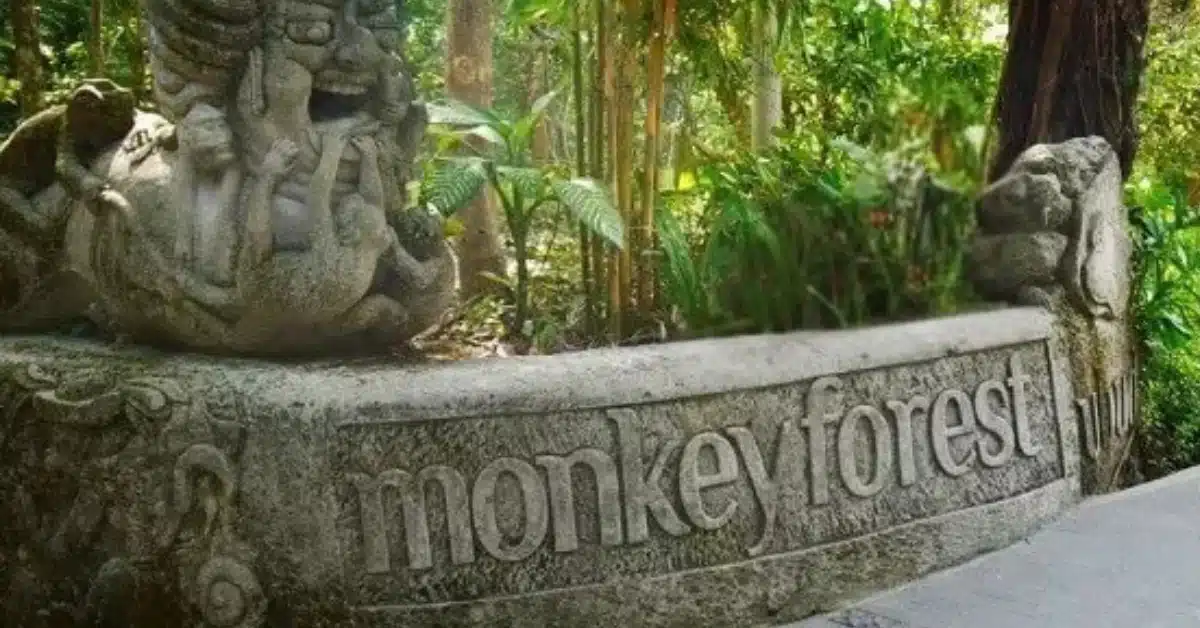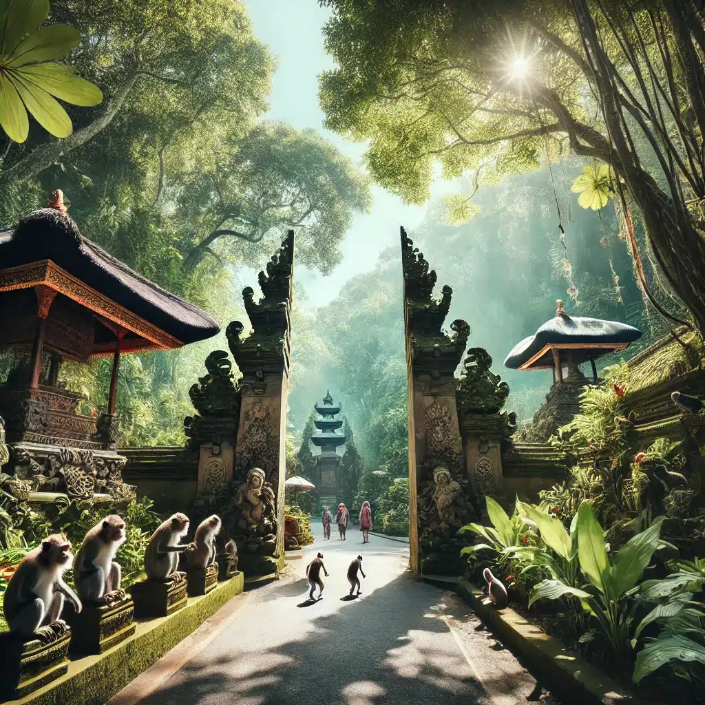 Pintu masuk Hutan Monyet Ubud dengan arsitektur tradisional Bali, pohon rindang, dan monyet liar di latar belakang.