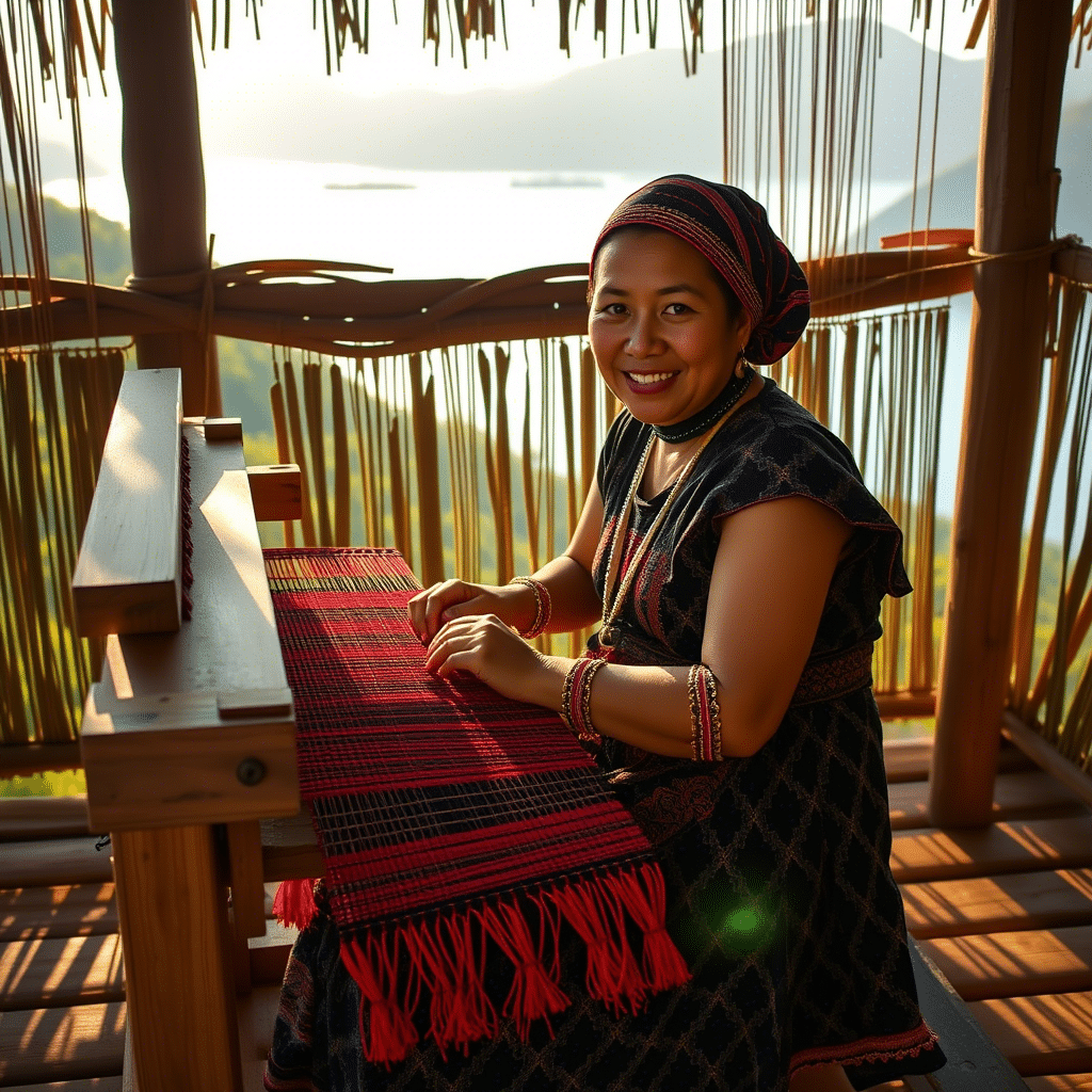 Seni menenun ulos oleh wanita Batak dengan latar belakang Danau Toba, menggambarkan hubungan erat antara budaya, tradisi, dan keindahan alam Sumatera Utara